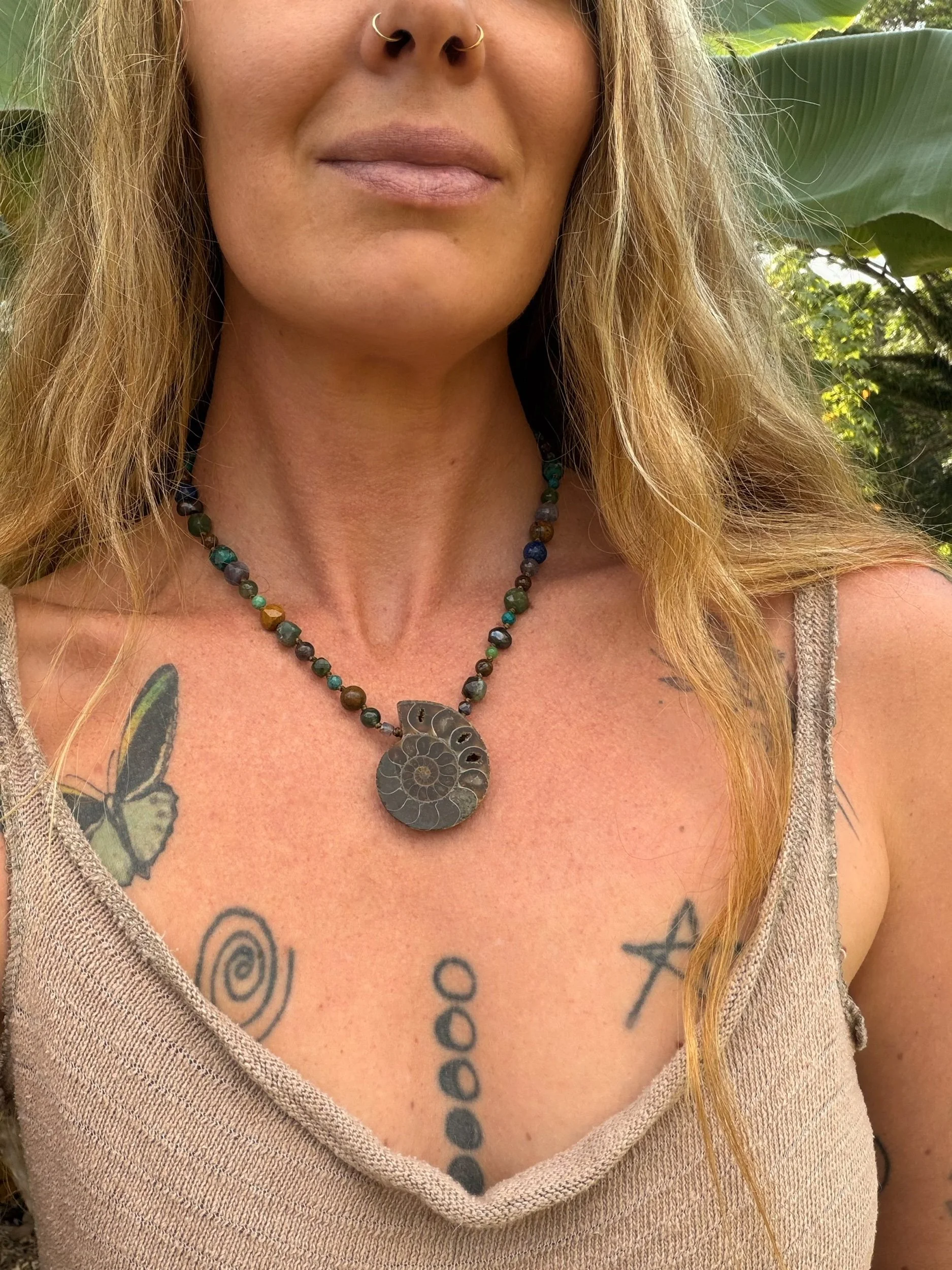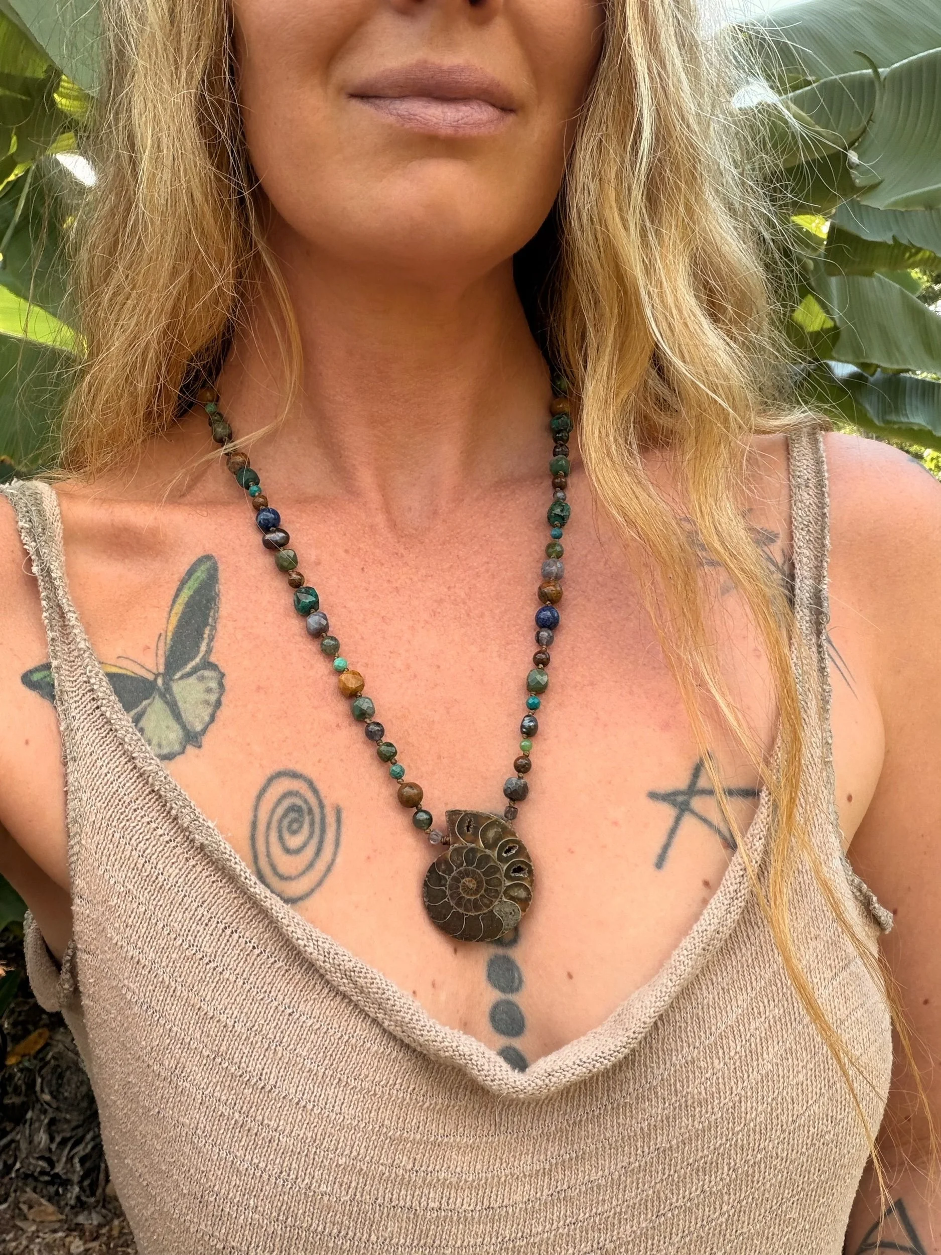 Ammonite shell fossil necklace on an adjustable crystal bead necklace.